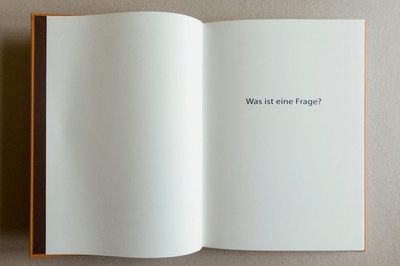 „Am Anfang diese Frage nach der Frage, die gleich die ganze Aufmerksamkeit weckt. Dann folgt die eine leere Seite, die die Frage noch vertieft.